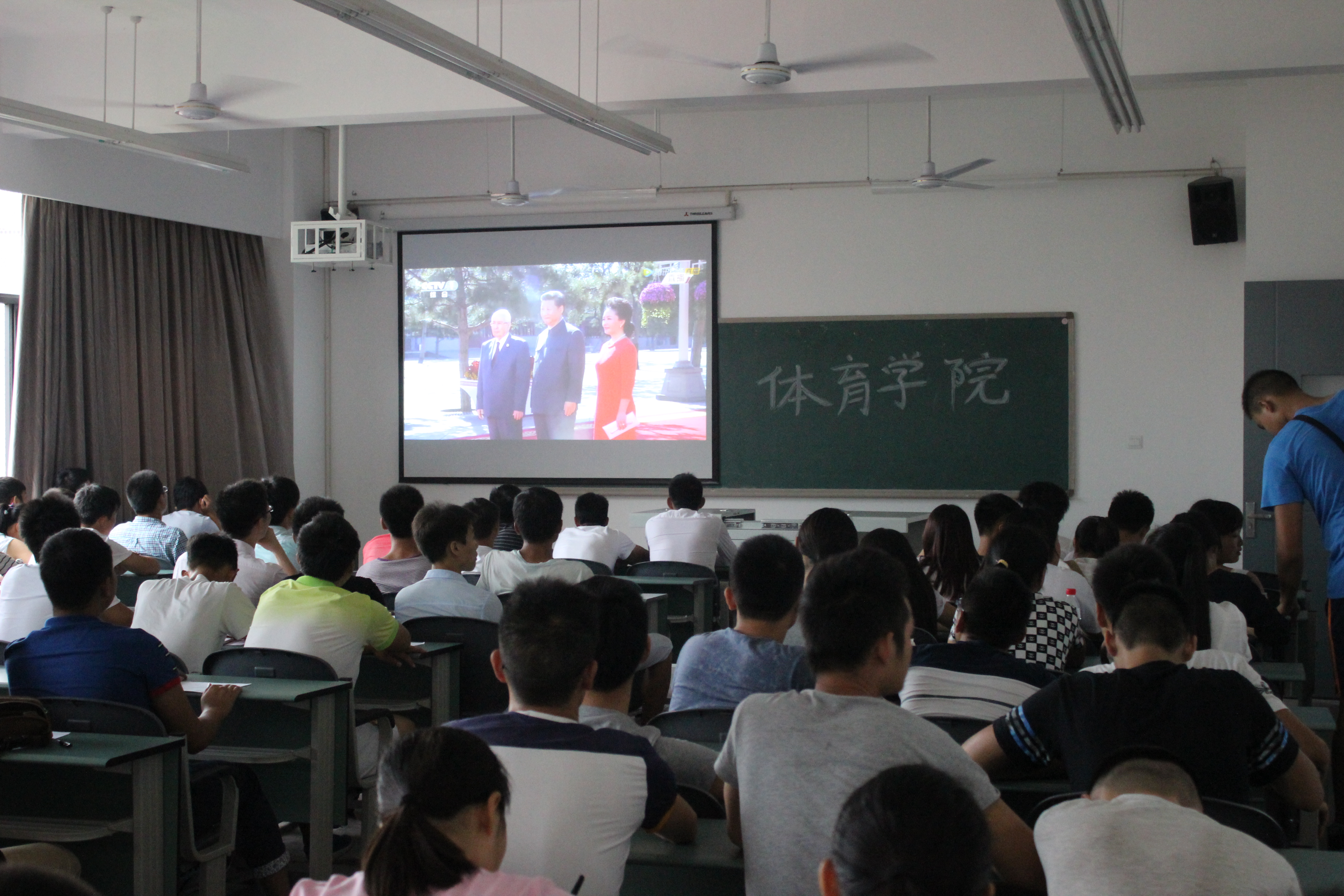 为隆重纪念中国人民抗日战争暨世界反法西斯战争胜利70周年,93日上午,佘涛书记、张皓副书记、李霞和那明明辅导员与300多名员工在传媒楼四楼共同观看了阅兵式直播。