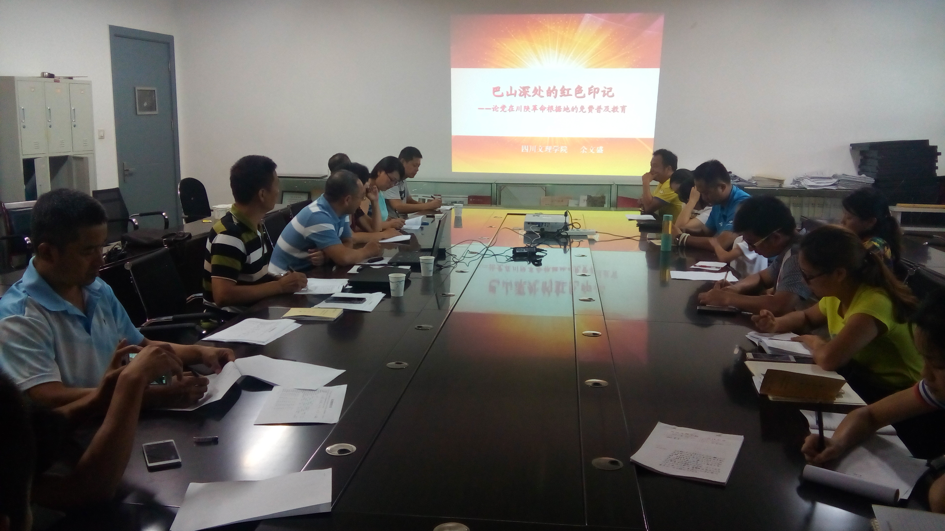 628下午,公司全体教师党员和部分员工党员,在传媒大楼1011会议室,聆听了宣传部部长余文盛教授题为“巴山深处的红色印记——论党在川陕革命根据地的免费教育”的专题党课。