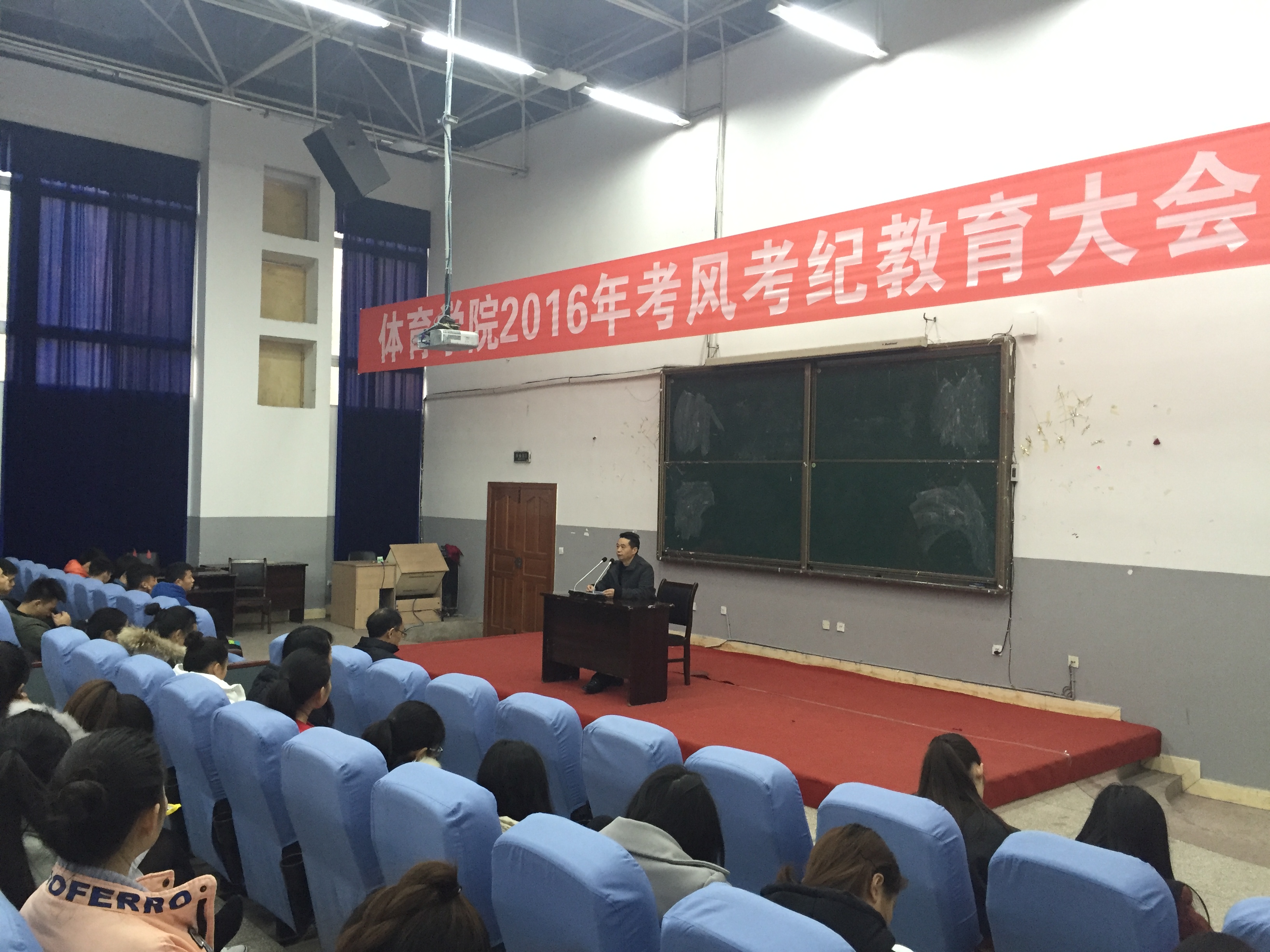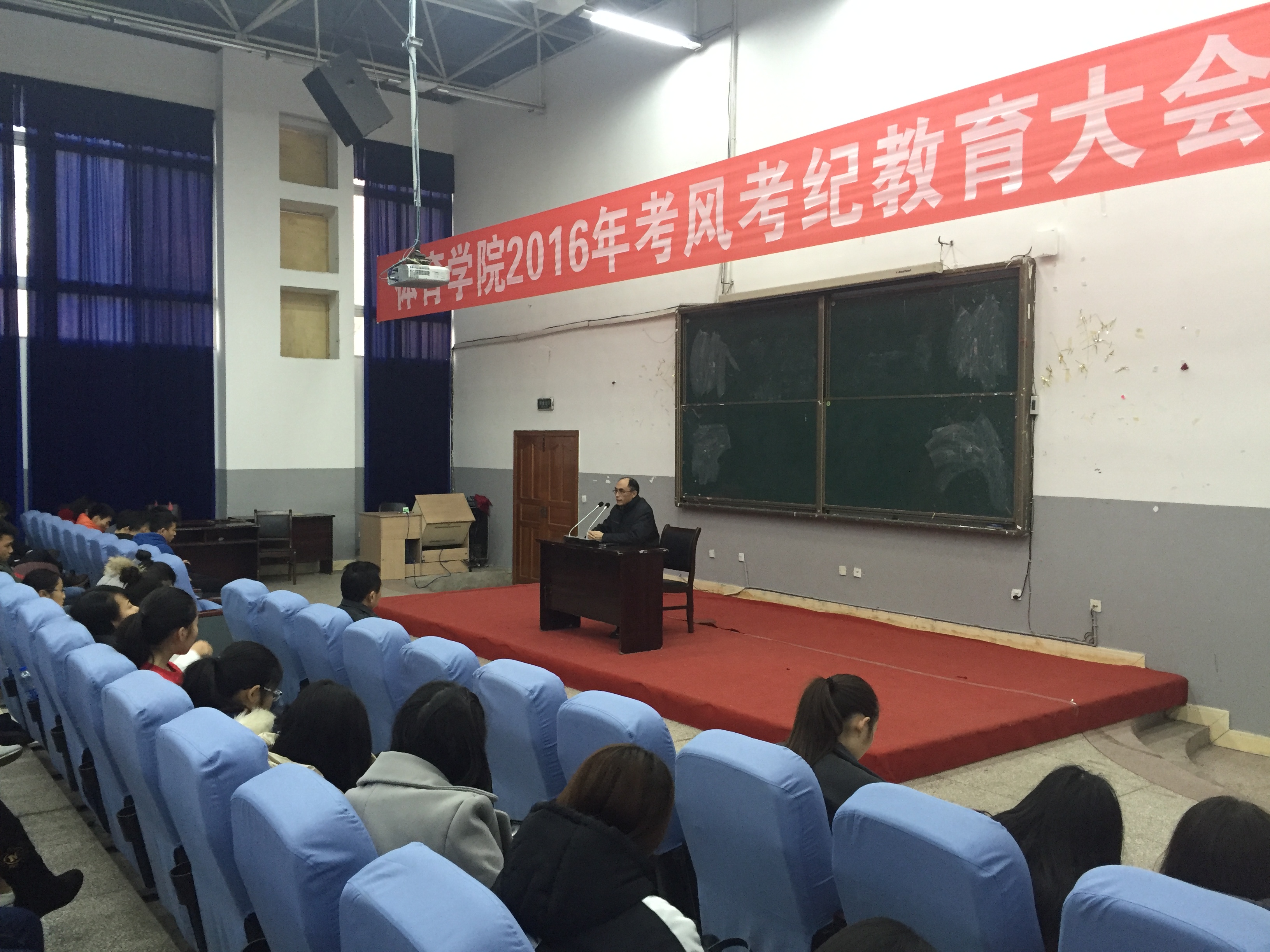 1月3日16:30,公司2016学年考风考纪教育大会在一教学楼113教室召开。参加此次大会的有公司副经理陈碧述老师,公司党总支副书记王进老师,辅导员那明明老师以及2016级全体员工。