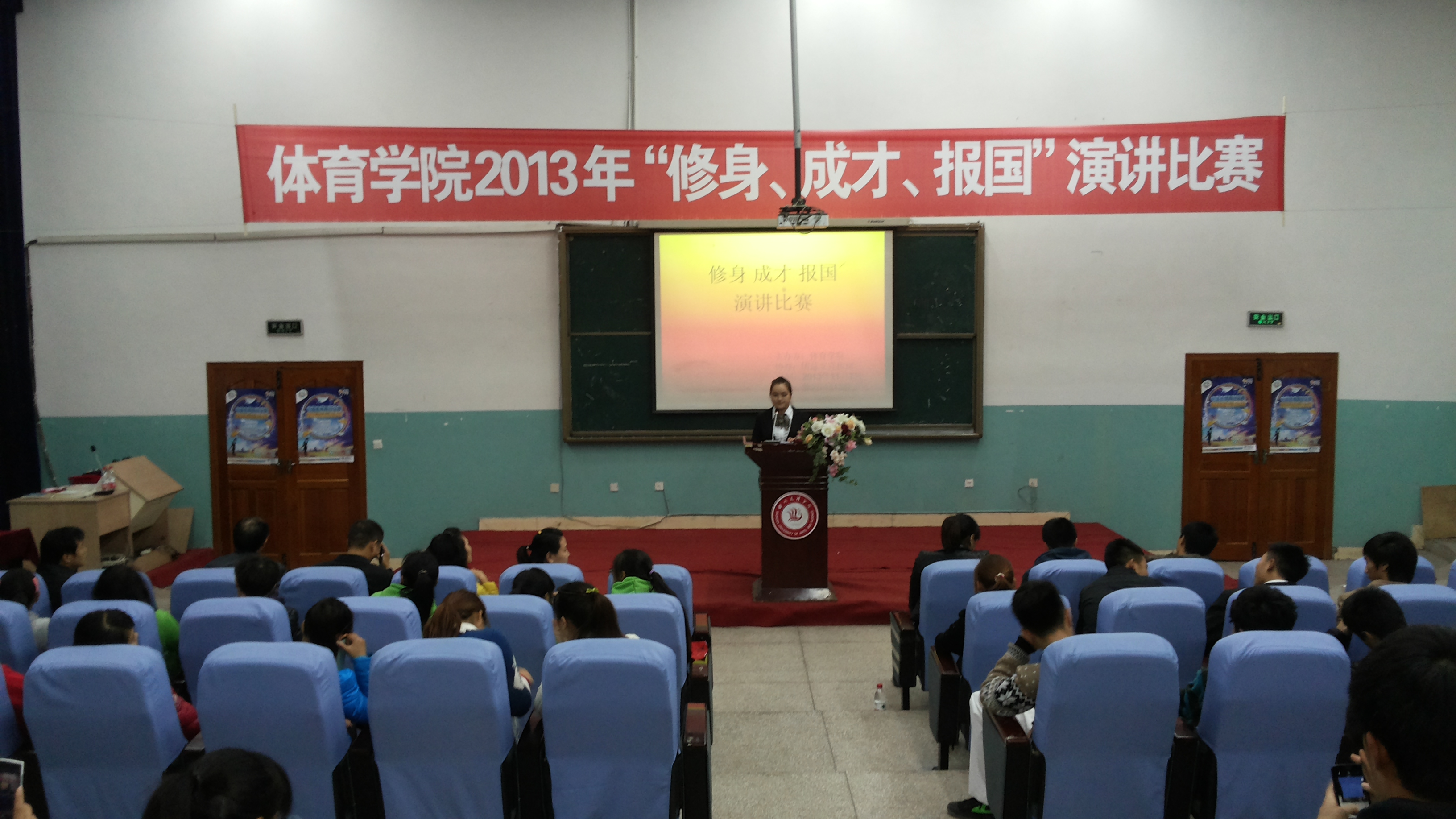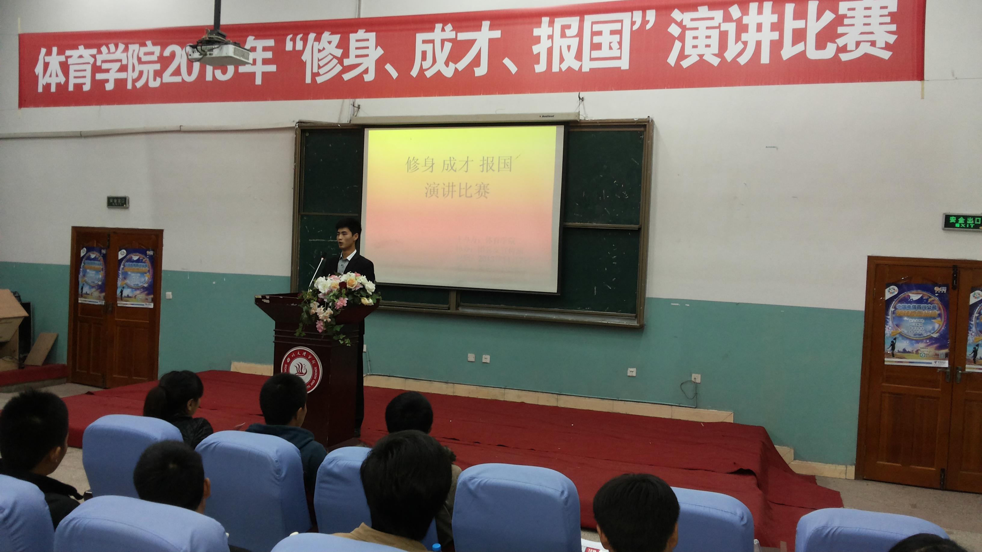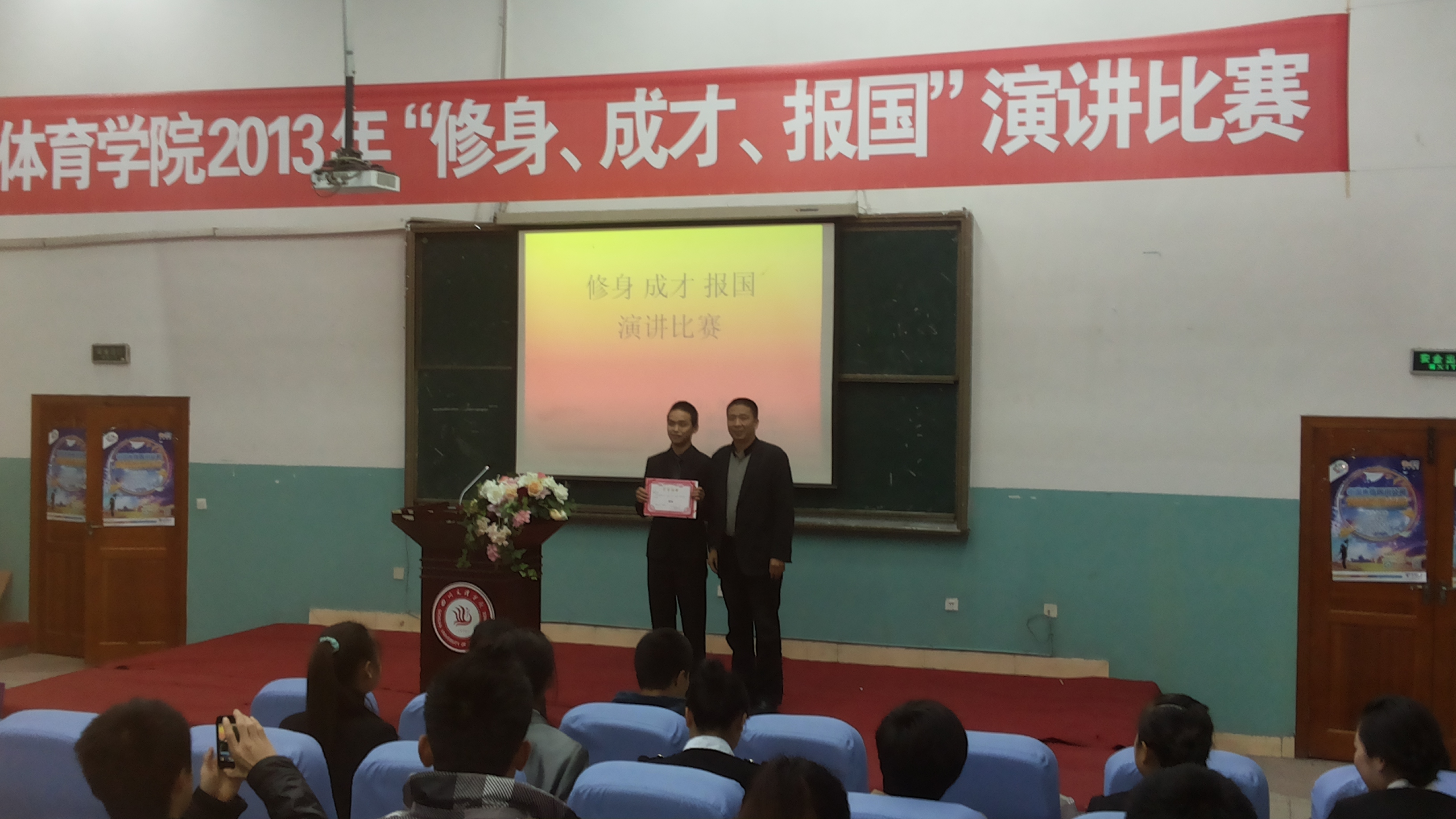 2013117日,公司在莲湖校区113教室成功举办了第十四届“修身、成才、报国”演讲比赛。公司党总支书记佘涛、副主任陈碧述、副书记张皓、辅导员李霞、那明明及体育系团总支员工会的重要干部担任了本次比赛的评委。2013200余名员工共同观看了比赛。本次演讲比赛由何其波同学主持。