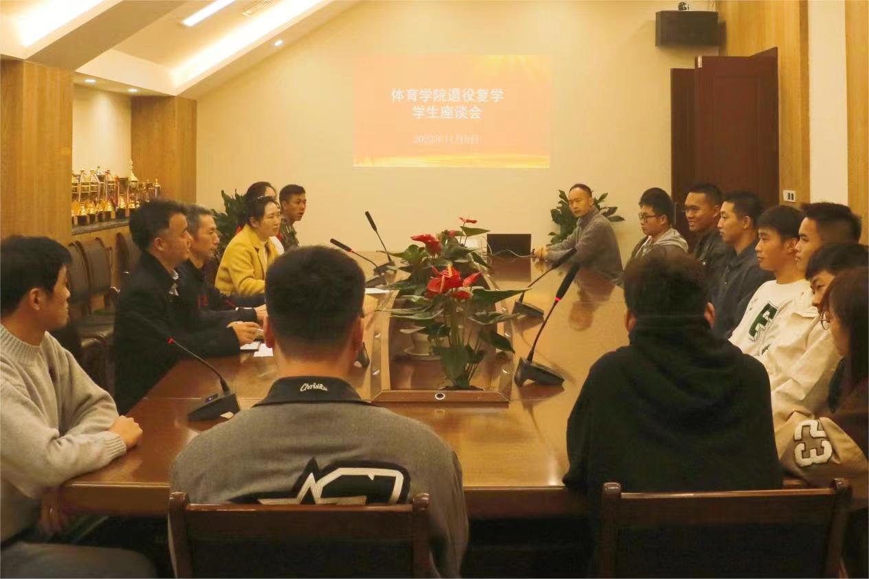2023119日中午12:10在体育馆117会议室召开退役复学员工座谈会。bevictor1946韦德官网党委书记王兆忠,党委副书记靳浪,学工办主任祝利平,辅导员石姣娜、李波及退役复学员工代表出席本次会议。会议由学工办主任祝利平主持。