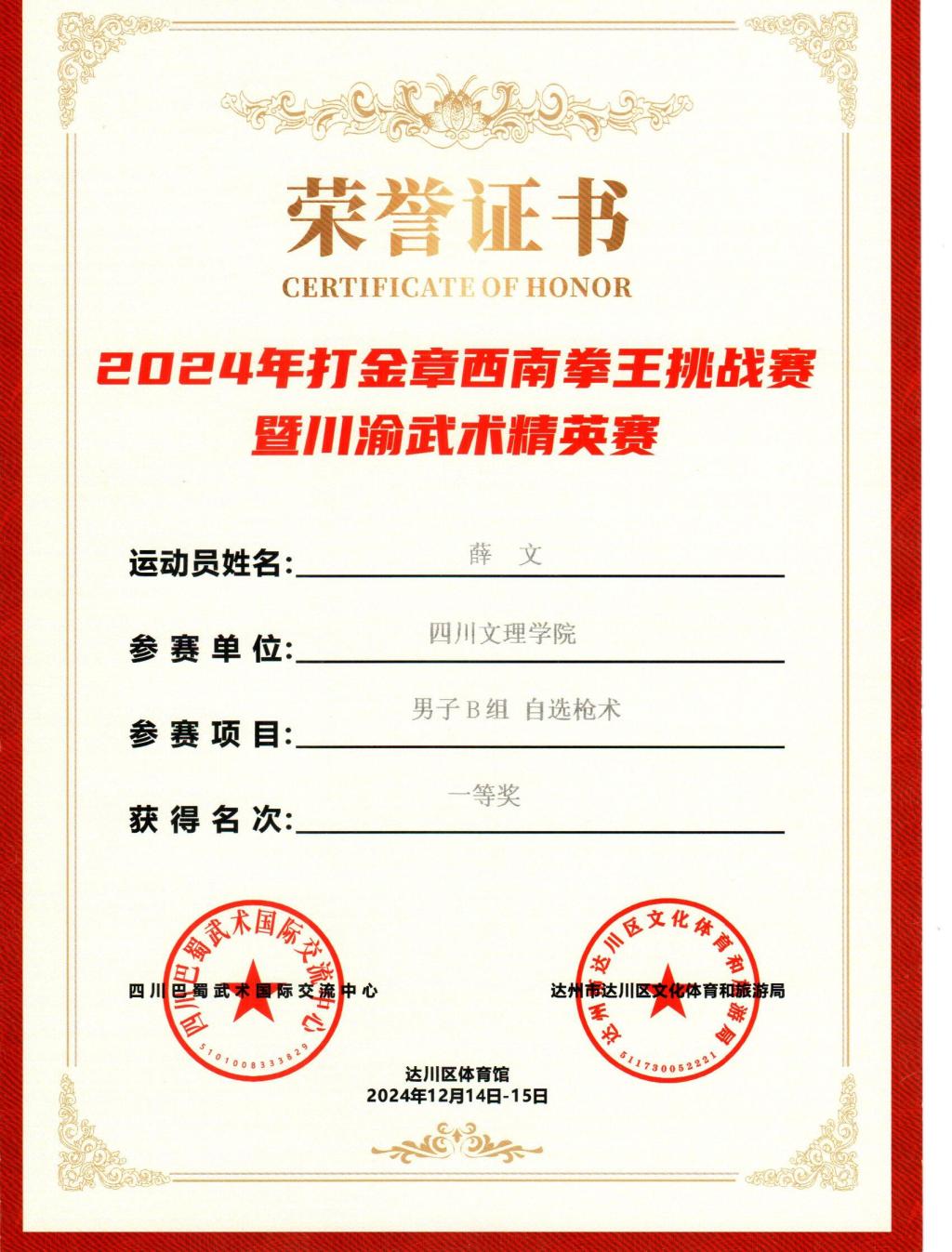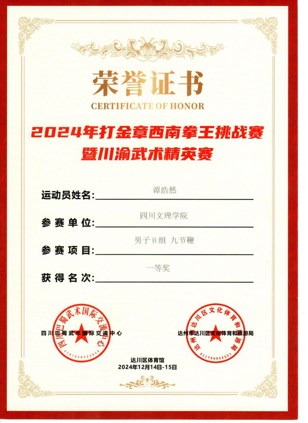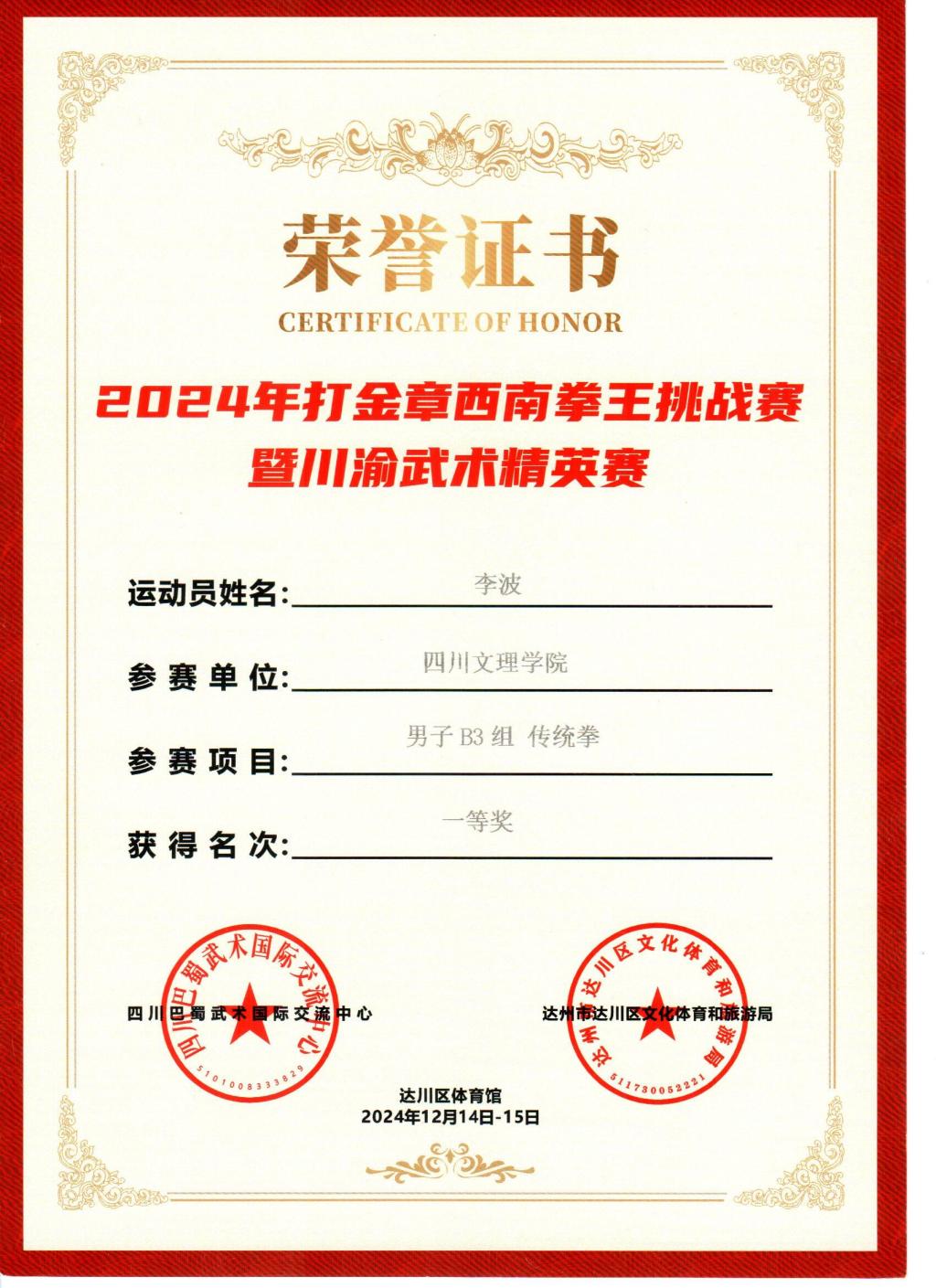2024121315日,由达川区人民政府及四川巴蜀武术国际交流中心主办,达川区文化体育和旅游局承办的2024年打金章西南拳王挑战赛暨川渝武术精英赛在达州市达川区体育馆举行,本次比赛吸引了国内外近300余名运动员参赛。